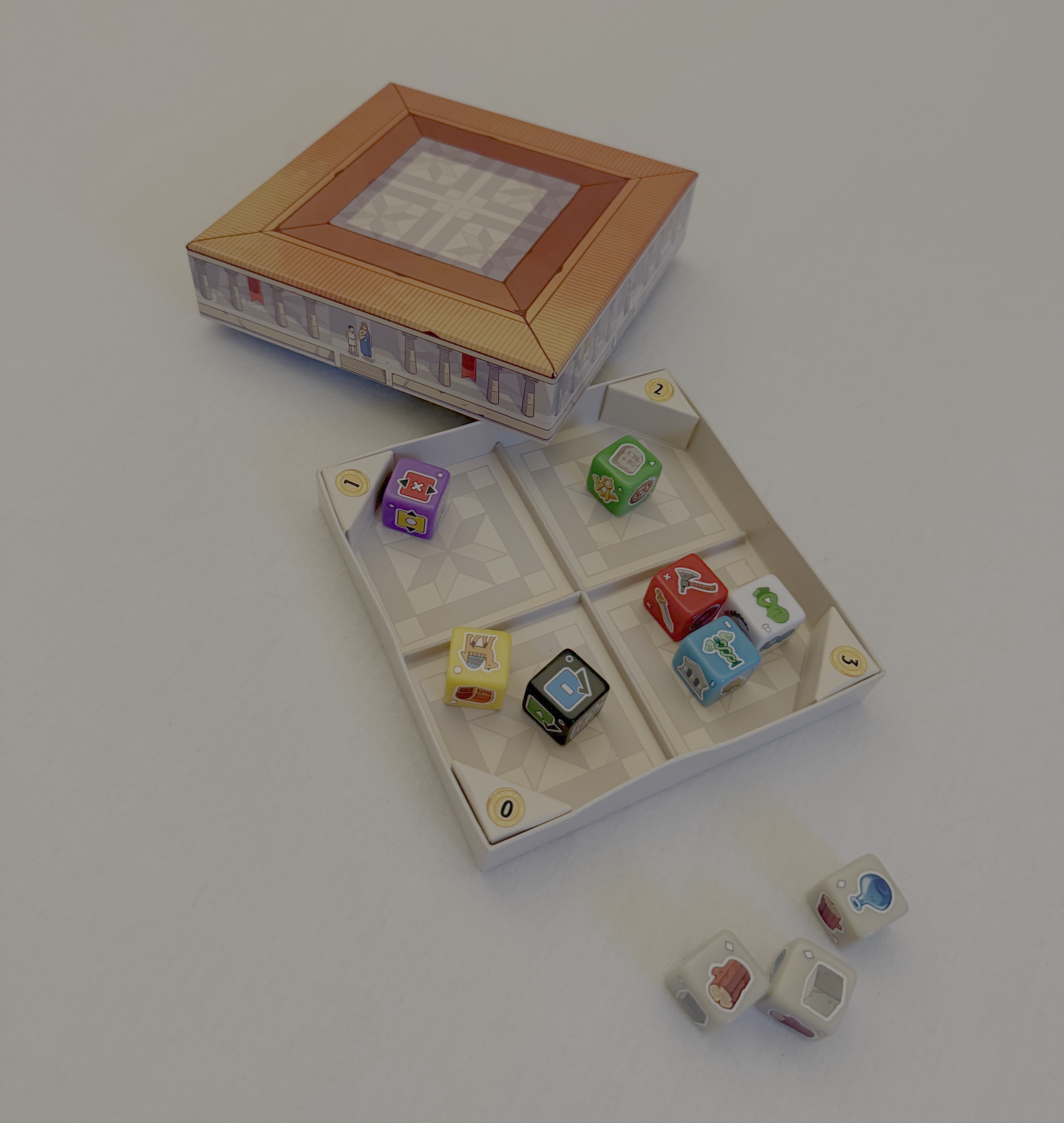 In der Mitte liegt das Forum, eine Würfelbox mit vier Kostenfeldern. Zu Beginn eines Zuges werden die Würfel darin gewürfelt und allen zugänglich gemacht.