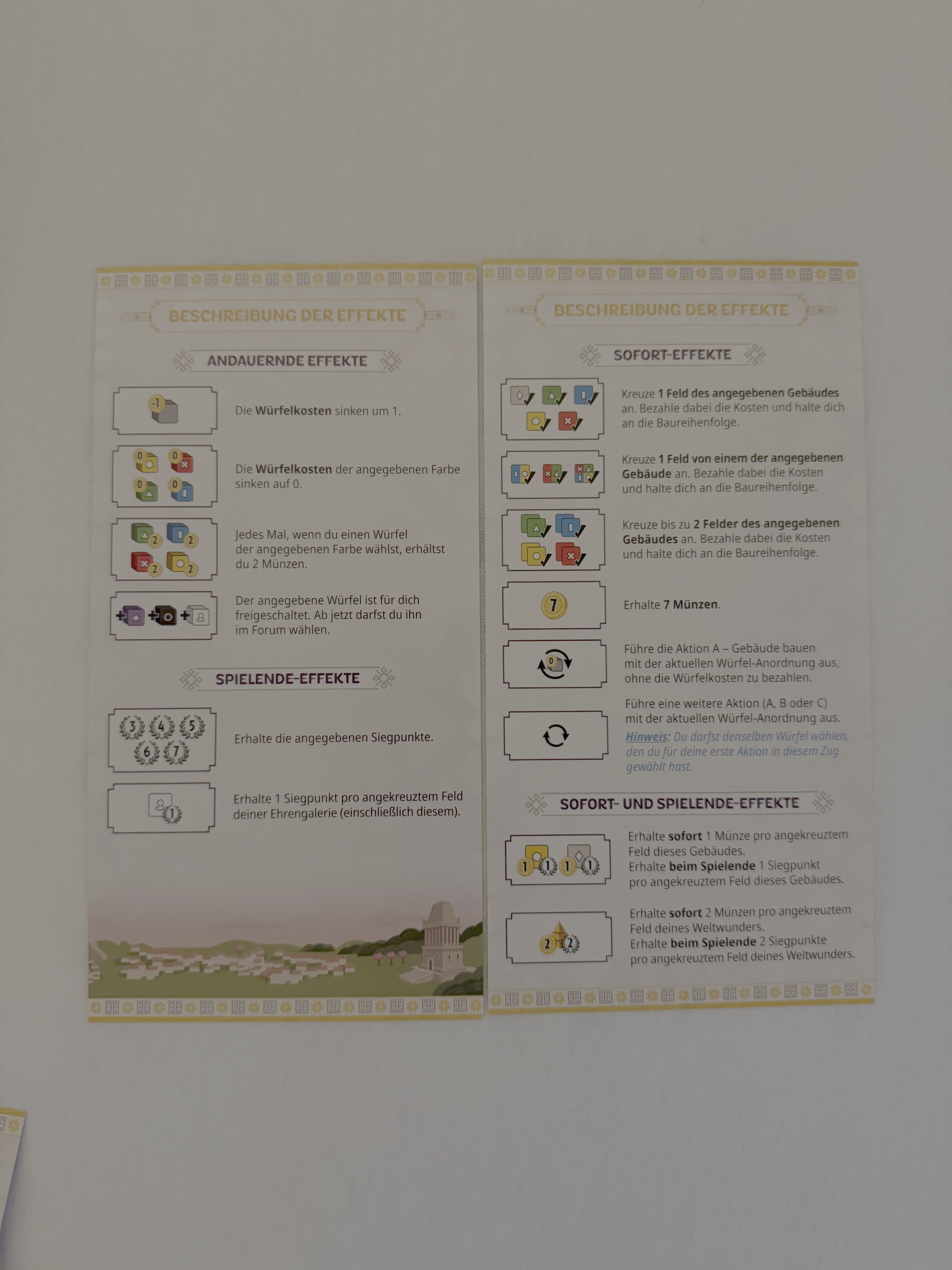 Alle wählen gleichzeitig genau einen Würfel und bezahlen dessen Kosten in Münzen (0-3), dann bauen sie das zugehörige Gebäudefeld auf dem eigenen Tableau. Mehrere Personen dürfen denselben Würfel wählen und eines der sechs Stadtgebäude bebauen. Alternativ lässt sich das Weltwunder ohne Würfel weiterbauen oder gepasst werden, was drei Münzen bringt.