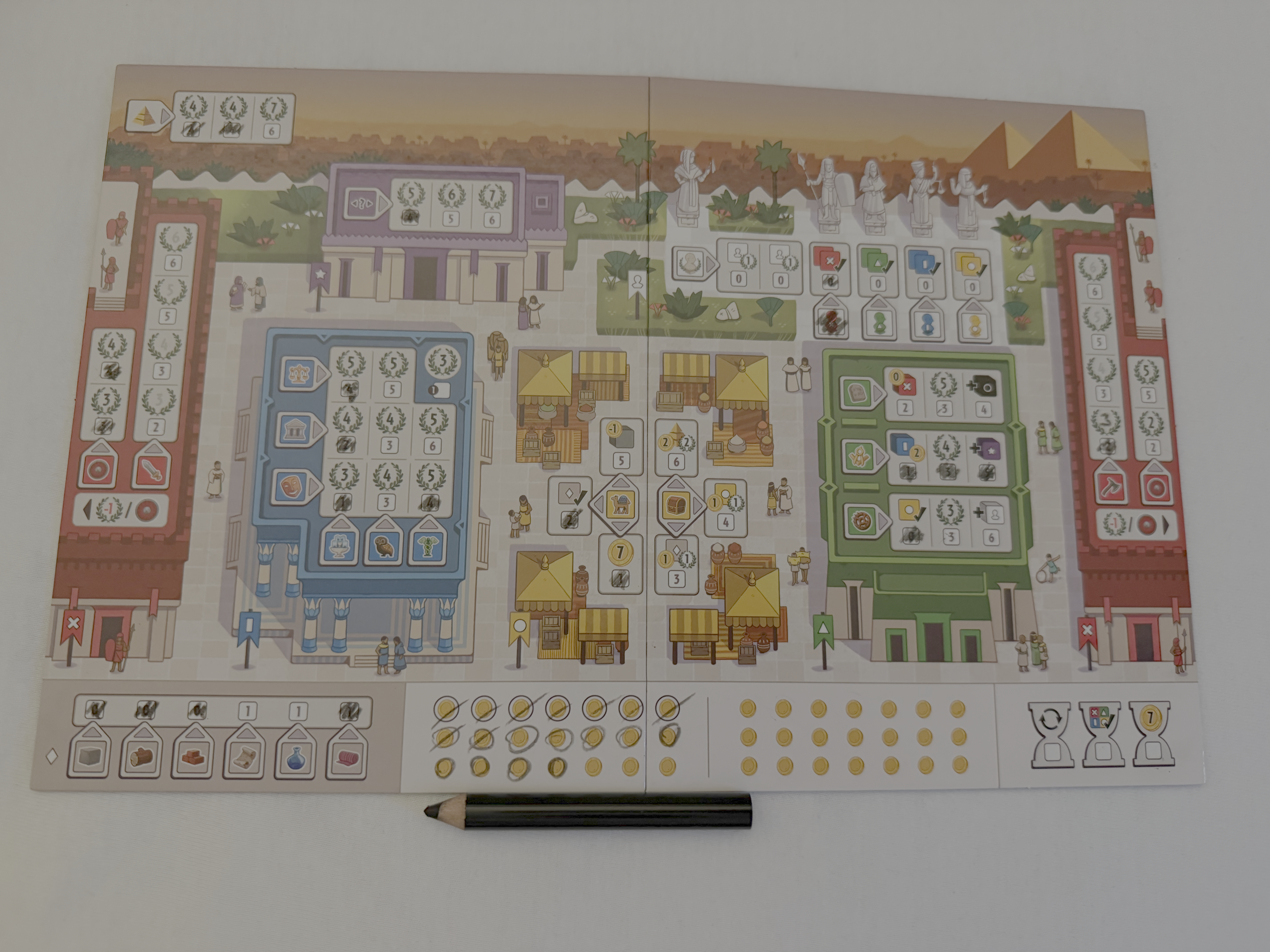 Rohstoffe liefert die Lagerhalle dauerhaft. Fehlen Rohstoffe, gleichen Münzen die Lücke aus. Wer ein Gebäude komplettiert, markiert einen von drei Bonussen. Sobald jemand den dritten Bonus angekreuzt hat, folgen Rundenende und eine letzte Runde, danach wird gewertet.