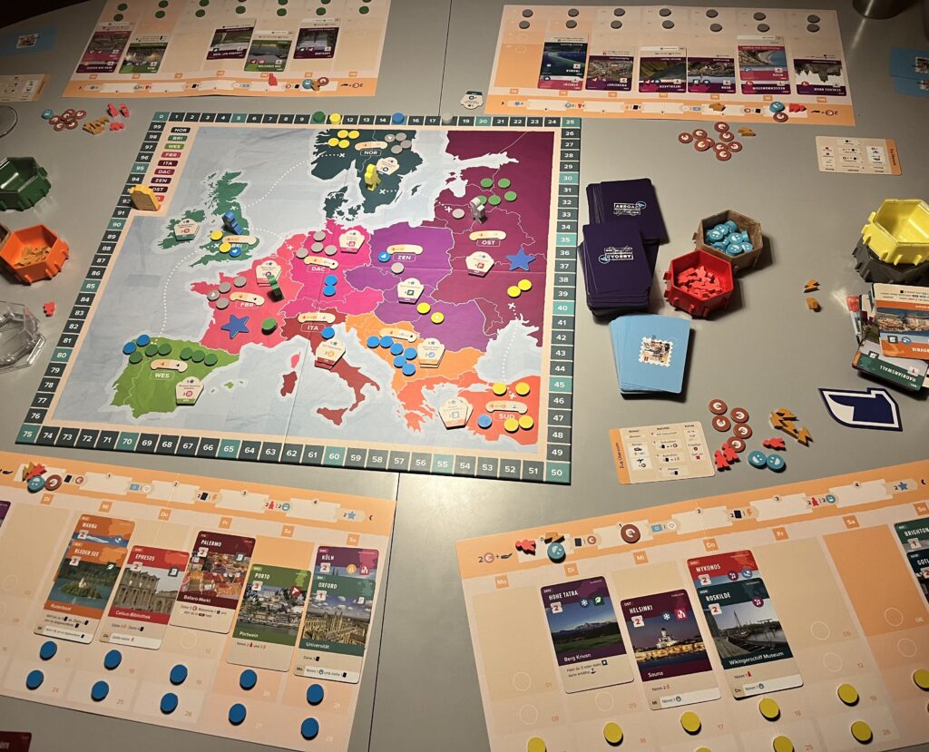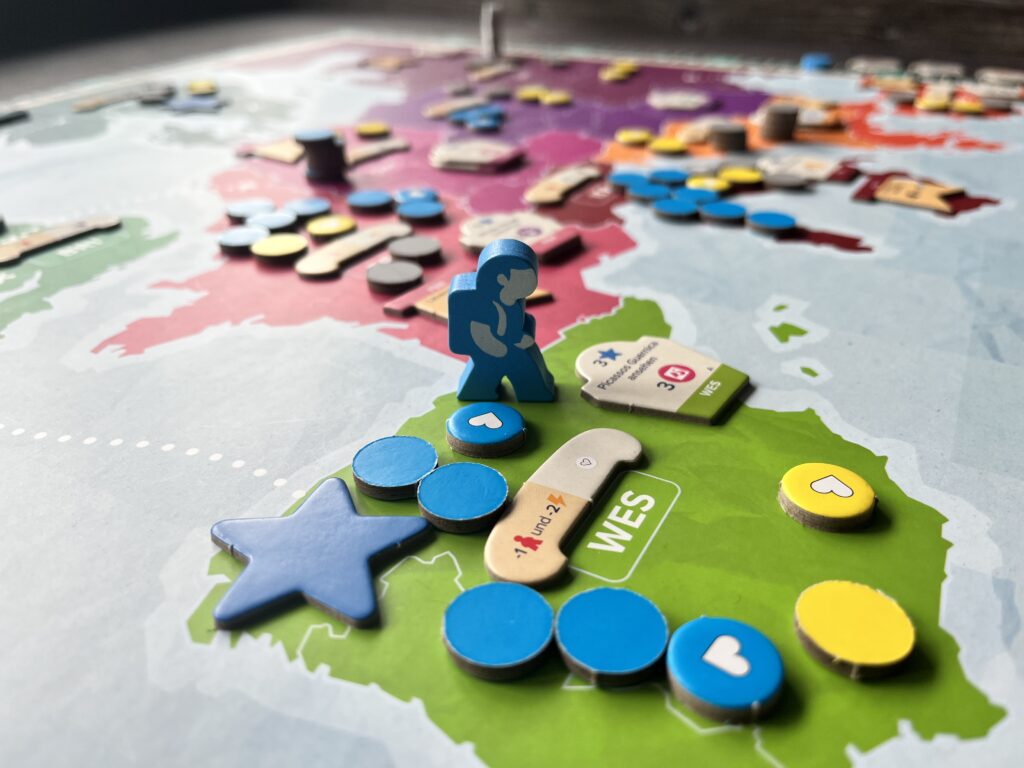 Jede mitspielende Person verfügt über ein Kalender-Tableau, auf dem anfangs noch unsere Tag-Scheiben liegen und später die Ortskarten unserer Reise ausgelegt werden. Sind wir an der Reihe, darf unsere Spielfigur über den zentralen Spielplan mit der Karte Europas reisen – mit dem Zug oder dem Flugzeug. Dann spielen wir eine Ortskarte passend zu der bereisten Region in unseren Kalender. Je nachdem, wie viele Tage unser Reiseziel „verbraucht“, nehmen wir Tag-Scheiben von unserem Tableau und legen sie auf die besuchte Region auf dem Spielplan. Mit diesen Scheiben möchten wir Mehrheiten in den Regionen erringen, die jeweils am Ende einer Woche gewertet werden, und für die wir Punkte erhalten. Auf die Mehrheiten-Wertung können wir weiteren Einfluss nehmen, wenn wir eine Tag-Scheibe auf die Geheimtipp-Rückseite drehen dürfen, denn diese erhöht unseren Einfluss enorm.
