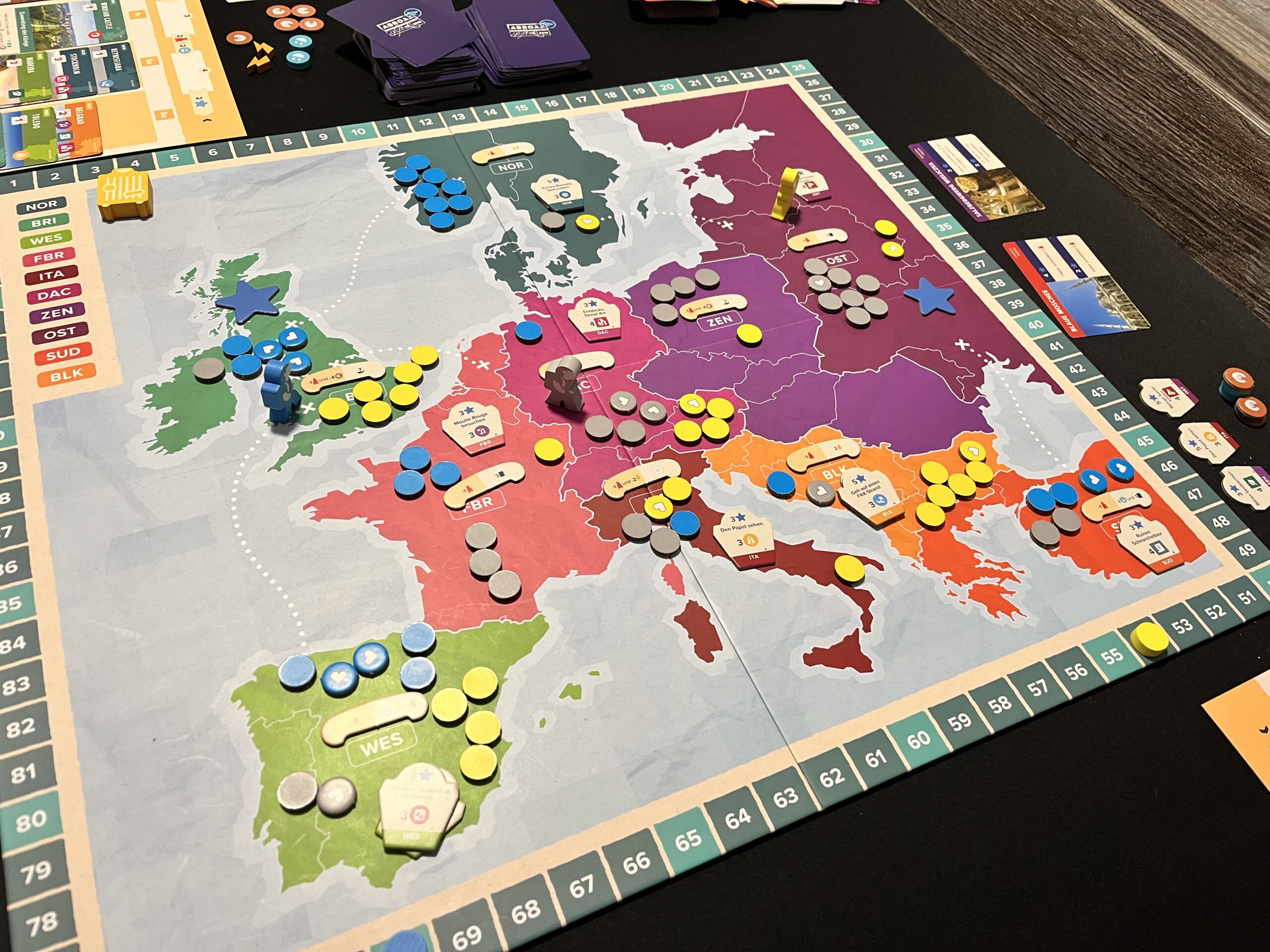 Leider ist die Gestaltung des Spiels an einigen Stellen unglücklich gelaufen. So gut mir das Cover auch gefällt: Der nüchtern gestaltete Spielplan scheint direkt dem Diercke Atlas entnommen. Klar, dass der Plan zurückgenommen gestaltet sein muss, denn mit den Markern, Figuren und Bucket-List-Plättchen ist dort während der Partie bereits genug los. Aber die Farbgebung mit unterschiedlichsten Rosa- bis Lila-Tönen ist für einige eine Herausforderung in Sachen Unterscheidbarkeit. Da nutzt auch das Regionen-Kürzel auf den Karten nicht immer weiter, da es zu einem Druckfehler gekommen ist. Auch die Bedeutung der Regionen-Bezeichnung lässt uns teilweise fragend zurück (FBR???). Die Beschriftung der Bucket-List-, Festival- und vor allem der Ortskundigen-Plättchen ist extrem klein geraten, so dass Brillenträger die Aktionsoption leider auch manchmal deshalb vergessen, da sie sie gar nicht sehen.