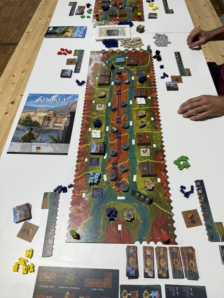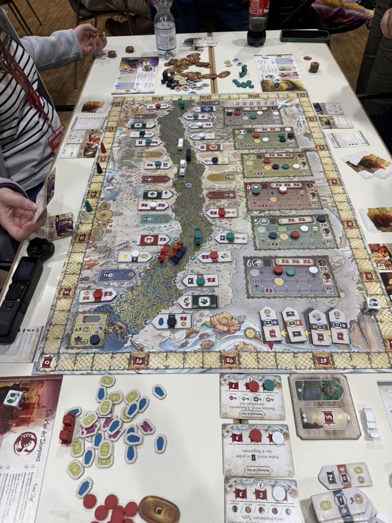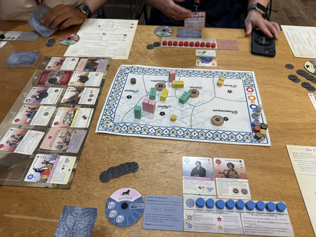 Der perfekte Abschluss: Pax Pamir, perfekt erklärt von Spartacus (YouTube), gespielt mit Michael & Melanie (YouTube) von MillionBoardgames sowie Jörn. Politisch, elegant, tief – besser kann man die Con nicht beenden.