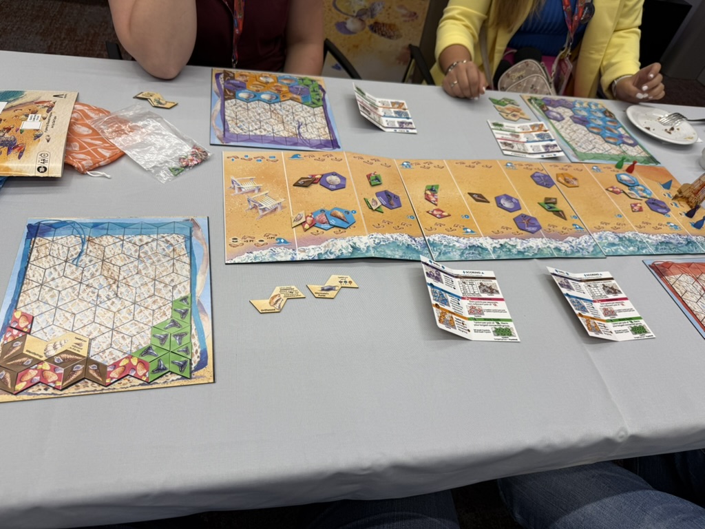 - Sanibel: Neues Spiel von Elizabeth Hargrave (Flügelschlag). Ihr lauft am Strand entlang, sammelt Strandgut und puzzelt es in eure Tasche. Sieben verschiedene Möglichkeiten zu punkten – eine entspannte Mischung aus Naturthema, Tetris und Tableau-Aufbau.