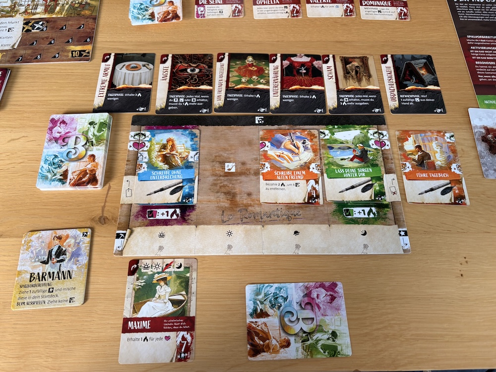 Sollten wir den ganzen Tag mit unseren künstlerischen Gewohnheiten verbringen, also alle vier Kartenslots nutzen um Inspirationspunkte zu sammeln, ziehen wir zusätzlich eine Leiden-Karte, die sich in unser Deck gesellt. Diese müssen später im Spiel ebenfalls ausgespielt werden, wenn gezogen, und sorgen für negative Effekte. Sie verteuern für diese Runde den Kauf von Karten oder minimieren unsere Inspirationspunkte. Wir können dies verhindern, in dem wir einen der vier Tagesslots mit unserer Berufskarte, die uns immer zur Verfügung steht, belegen. Diese Karte bringt keine Symbole mit, verhindert aber das Ziehen einer Leiden-Karte.