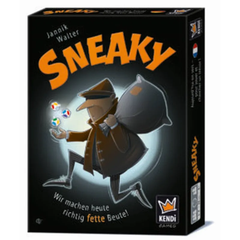 SNEAKY ist ein kurzes Würfel und Kartenspiel. Ihr würfelt um Räuber aus der Tischmitte, sammelt sie als Beute und müsst gleichzeitig damit rechnen, dass andere euch die wertvolleren Karten wieder abnehmen.