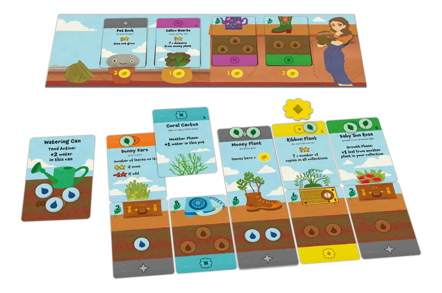 Gretchen’s Garden ist ein leicht zugängliches Tableau Building Spiel, in dem ihr euch über zwölf Runden eine eigene Sammlung aus Sukkulenten zusammenstellt. Ihr wählt nach und nach Pflanzen und Töpfe aus und versucht, eure Auslage so zu entwickeln, dass sie möglichst viele Punkte über passende Kombinationen und Set Effekte erzeugt.
