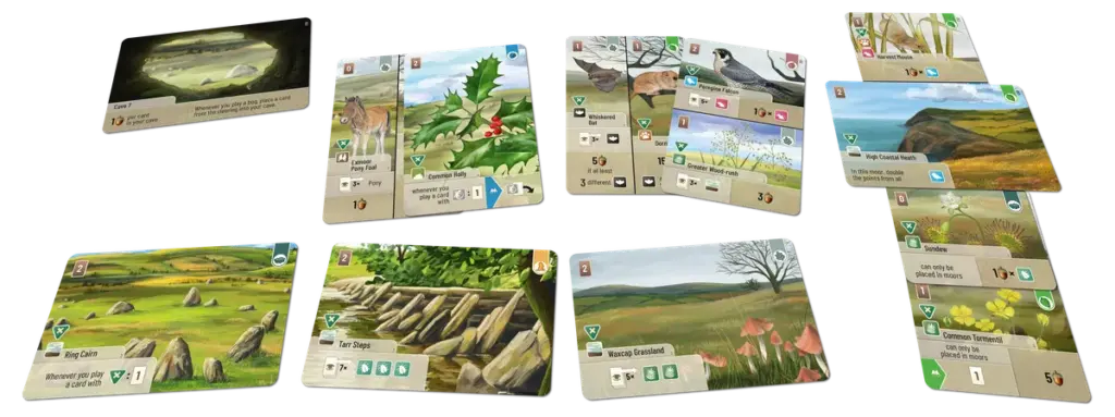 Neu sind vor allem Wasser bezogene Geländekarten. Sie können als eigene Landschaft ins Spiel kommen oder als „universelles Wasser“ unter Bäumen liegen und so mehrere Kartenbeziehungen ermöglichen. Viele der neuen Wertungen und Synergien drehen sich genau um dieses Element: Pflanzen und Tiere profitieren davon, wenn Wasser an der richtigen Stelle eingebunden ist.
