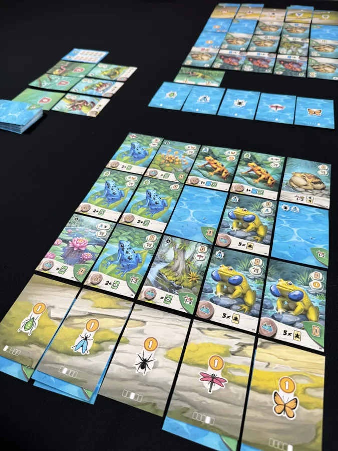 Runde für Runde wählst du Karten aus einer gemeinsamen Auslage und legst sie in dein Raster. Dabei versuchst du, die Bedingungen der verschiedenen Froscharten zu erfüllen und durch größere Gruppen derselben Art noch mehr Punkte zu sammeln.