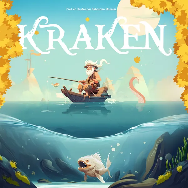 Kraken ist ein schnelles Piraten-Angelspiel mit verdeckten Zielen: Pro Zug ziehst du Karten, spielst Aktionen, würfelst zum Fangen und verbesserst deine Ausrüstung mit Goldfish-Marken.