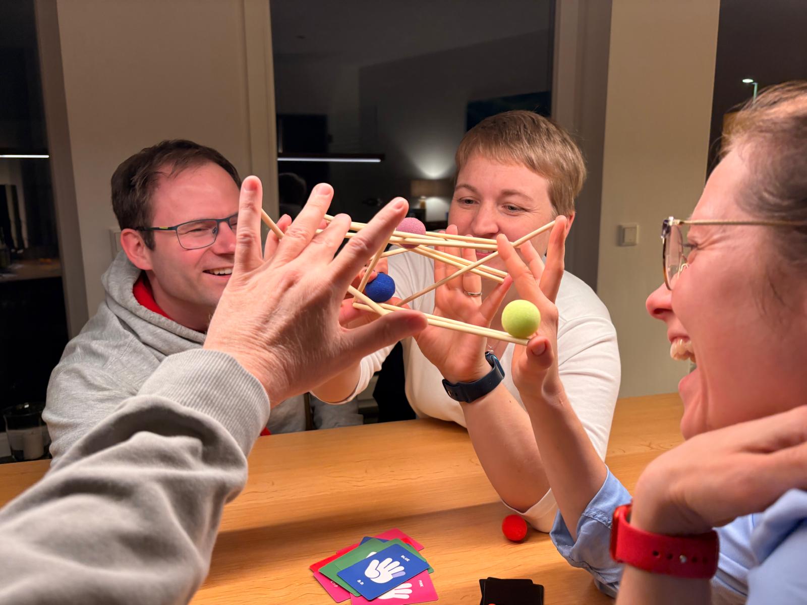 Dazu ziehen wir reihum eine Karte und müssen entsprechende Spielende mit Stäbchen verbinden.