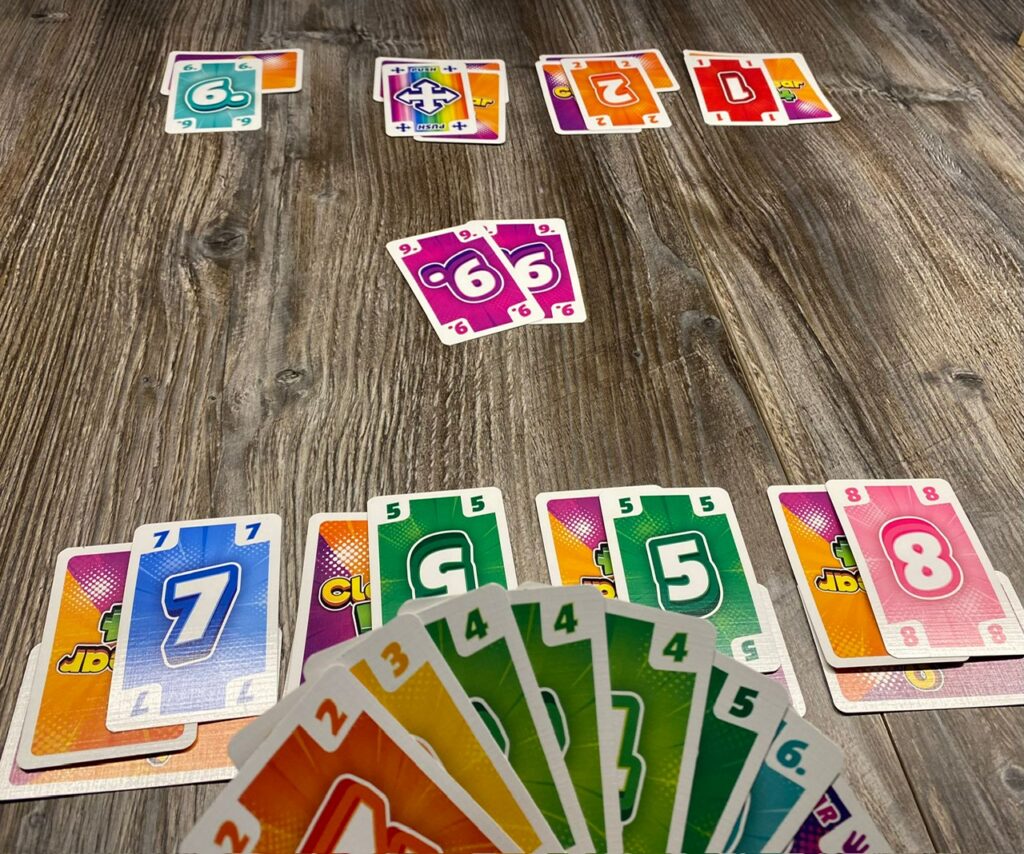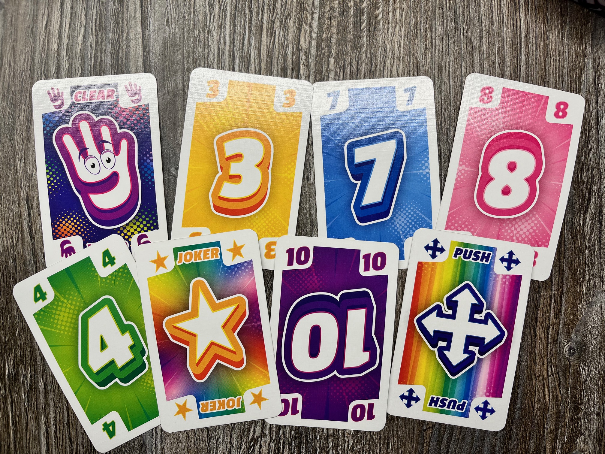 Man kann also durchaus taktisch spielen und sehr schnell durch clevere Kombination der Handkarten und vor sich liegenden Stapel die Anzahl der Karten reduzieren. Eine Portion Glück gehört natürlich auch dazu. Die Sonderkarten sorgen für zusätzliche Würze im Spiel, indem man zum Beispiel einer Person am Tisch, die vielleicht in einem der nächsten Züge Schluss machen könnte, durch eine Push-Karte den kompletten Ablagestapel rüberschieben kann. So ist nie klar, wer am Ende das Spiel gewinnt.