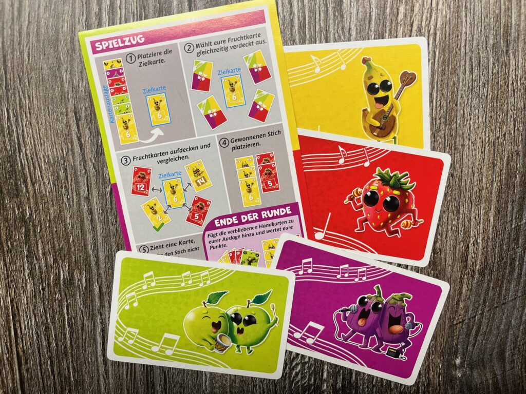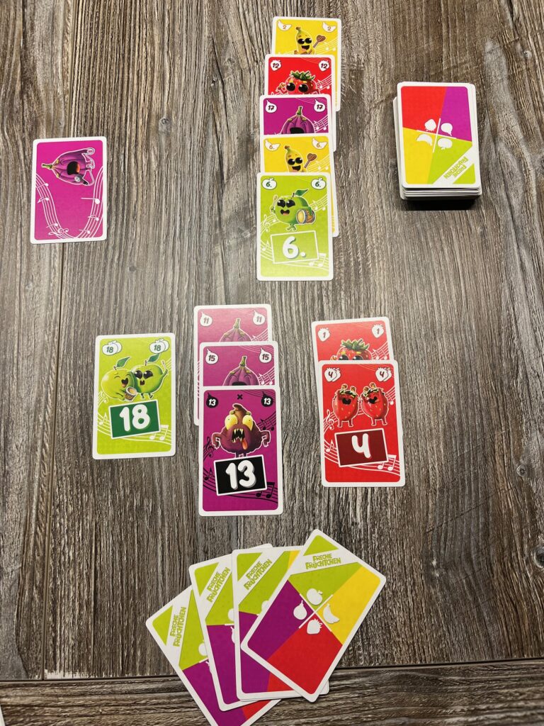 Je nach Anzahl mitspielender Personen erhalten wir 6 oder 7 Karten und dann geht es auch schon los. Wir spielen nun um die erste Karte in der offenen Auslage der 7 Zielkarten. Alle legen eine Handkarte verdeckt vor sich aus und decken gleichzeitig auf. Dabei herrscht kein Bedienzwang. Die Zielkarte erhält, wer die gleiche Fruchtsorte aufgedeckt hat und mit seinem Kartenwert am nächsten am Wert der Zielkarte liegt. Ist keine passende Fruchtsorten-Karte ausgespielt worden, gewinnt die Karte mit dem Wert, die am nächsten an dem der Zielkarte ist.