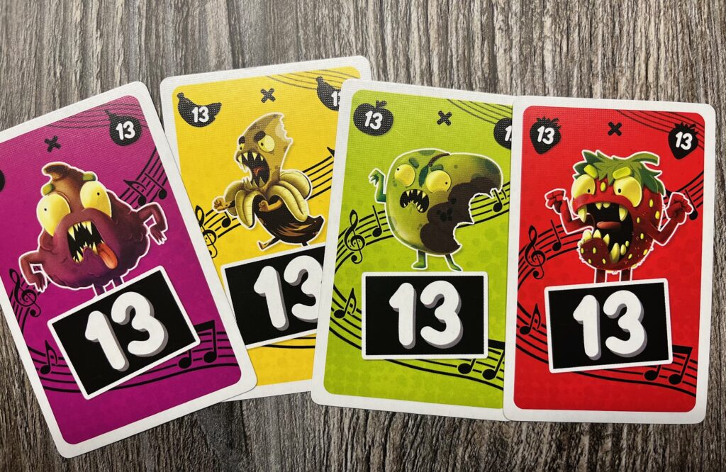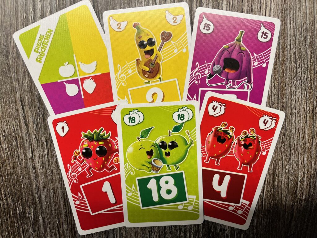 Karten gibt es in vier Farben – gelb/Banane, grün/Apfel, rot/Erdbeere und lila/Feige – und pro Farbe jeweils in den Werten 1 bis 20. Manche Karten tragen ein Fruchtsymbol, manche zwei und die 13 in jeder Farbe ist eine faule Frucht.