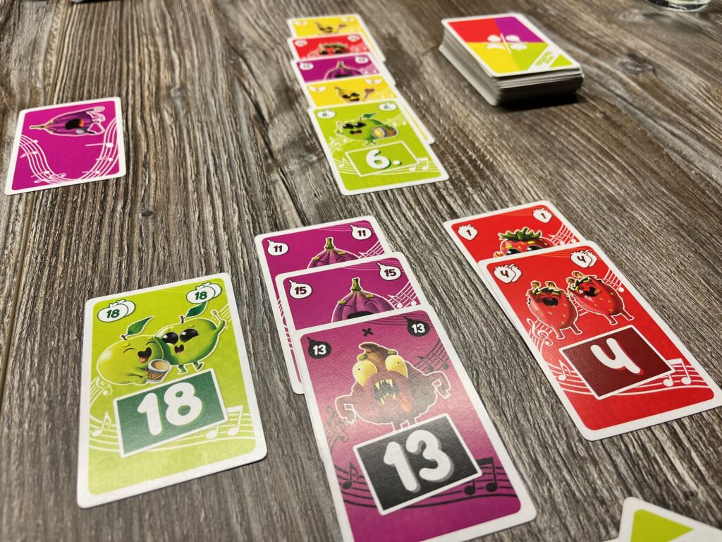 So spielen wir um alle 7 Karten. Am Ende einer jeden Runde erhalten wir Punkte. Vorher legen wir noch unsere verbliebenen Handkarten mit zu den vor uns ausliegenden Reihen und entfernen in den Reihen, die eine faule 13er-Frucht beinhalten, die faule Frucht und eine weitere Karte. Dann wird die Reihe der Früchte mit den wenigsten Fruchtsymbolen mit der Reihe mit dem meisten Fruchtsymbolen multipliziert. Liegt nur eine Reihe vor einem, wird diese mit sich selbst multipliziert.