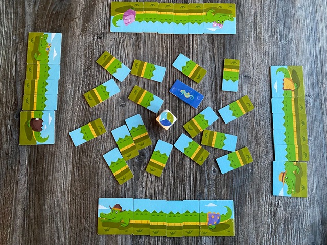 - Zeigt der Würfel eine Jokerlandschaft und bildet alle Landschaften ab, ist jedes Plättchen, das du in der Tischmitte aufdeckst, “richtig” und kann in das eigene Krokodil eingebaut werden.