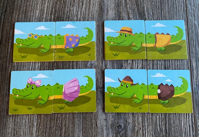 Jedes Kind sucht sich ein Krokodil seiner Wahl aus. Dieses besteht zu Beginn nur aus einem Kopf- und Schwanzteil. Nun werden die Tierplättchen verdeckt in die Tischmitte gelegt und gut durchgemischt. Auf den beidseitig bedruckten Plättchen sind drei unterschiedliche Arten von Tieren abgebildet: Tiere, die fliegen können, Tiere, die überwiegend im Wasser zu finden sind und solche, die an Land leben. Die Rückseite der Karten zeigt einen Krokodilbauch.