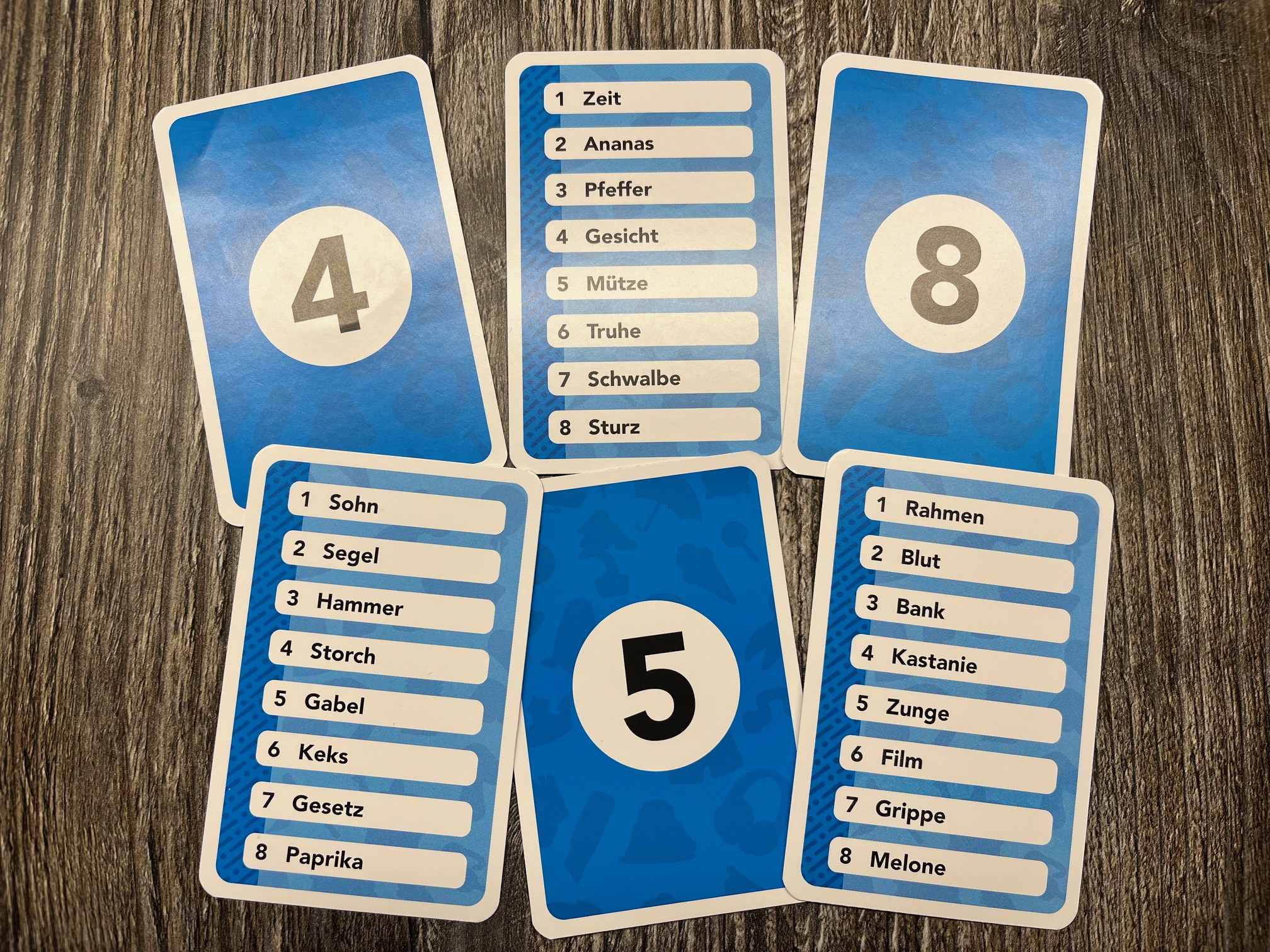 Das ist auch eine schöne Alternative für das Spielende, wenn die Buchstaben auf dem Tisch ausgehen und einem zu den letzten verfügbaren drei Buchstaben echt kein passender Einfall kommt. Da passt dann vielleicht ein anderer Begriff auf der Karte besser und man hat mehr Chancen.