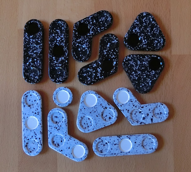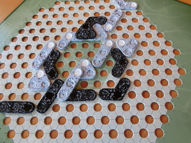 Das leere Spielbrett wird in die Mitte gelegt und die Spieler entscheiden sich für eine der zur Verfügung stehenden Farben: schwarz bzw. weiß. Wie so häufig beginnt weiß. Die 18 Spielsteine selber bestehen aus einem Hauptpunkt und zwei Nebenpunkten und stelle Geraden, Dreiecke und Winkel dar.