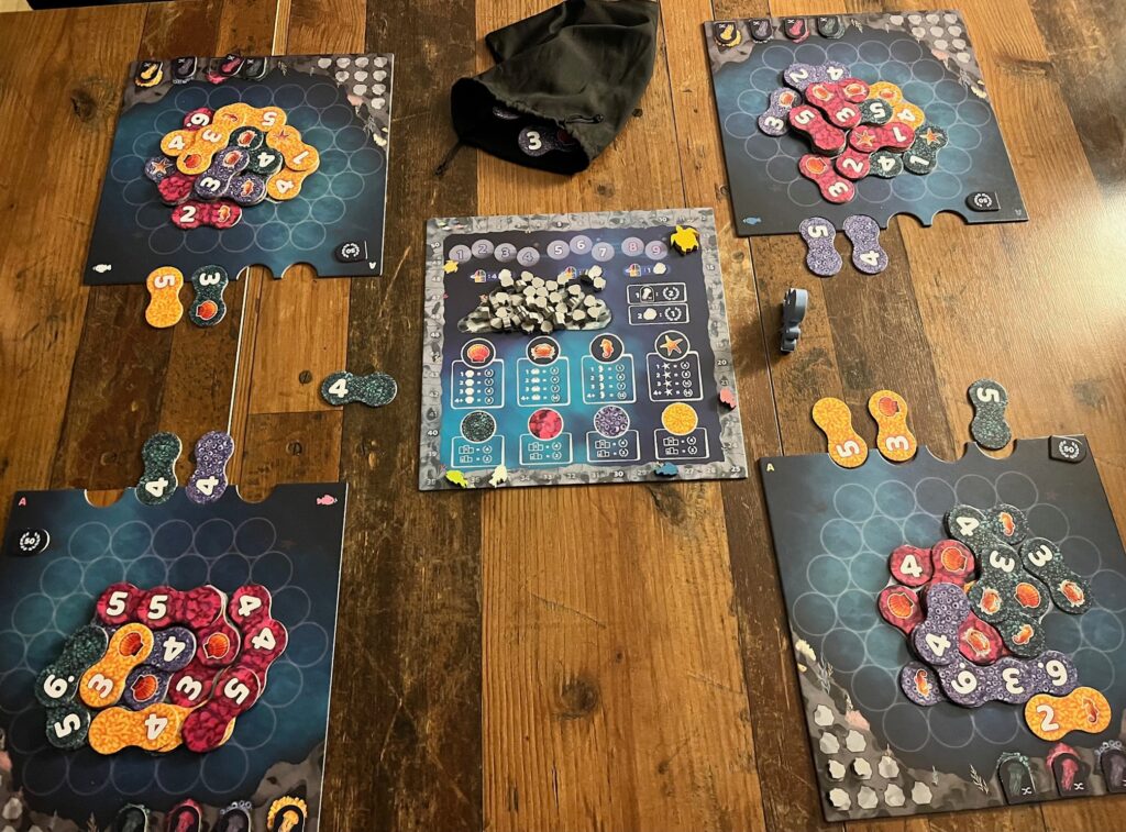 In Lumicora wollen wir ein vitales Korallenriff aufbauen. Dazu bekommt jeder ein Tableau, um dort das Riff aufzubauen. Jeder erhält ein Startlumino und platziert es als Anfangsplättchen auf dem Tableau. Außerdem ziehen alle vier Luminos – Korallenteile in vier unterschiedlichen Farben, beschriftet mit den Zahlen von 1 bis 6 und teilweise bedruckt mit Meerestieren – aus dem Säckchen und legen es oben in die Einkerbungen des eigenen Tableaus. Weitere vier Luminos bilden die offene Auslage.