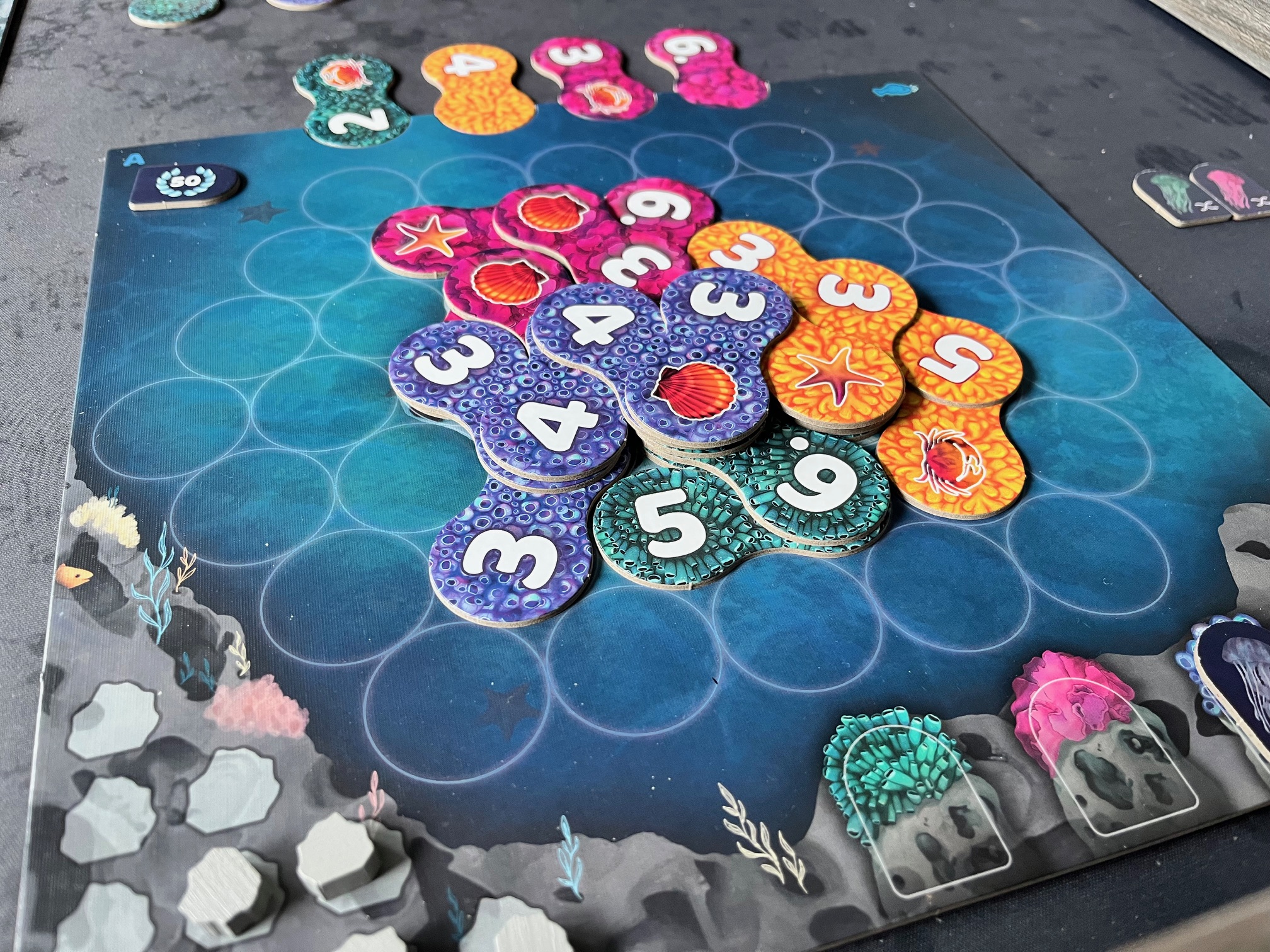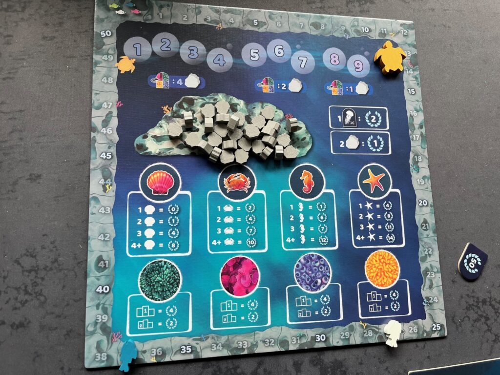 Wer sich mit dem optimalen Ebenenbau des Korallenriffs schwer tut, hat bei Spielende immer noch die Möglichkeit, mit der Gebietswertung und der Wertung der Tiere ordentlich Punkte zu machen. Sehr angenehm ist, dass das Spieltableau in der Tischmitte während der Partie klar anzeigt, was bei Spielende gewertet wird. So haben es alle klar vor Augen haben, für was es am Ende noch Punkte zu holen gibt.