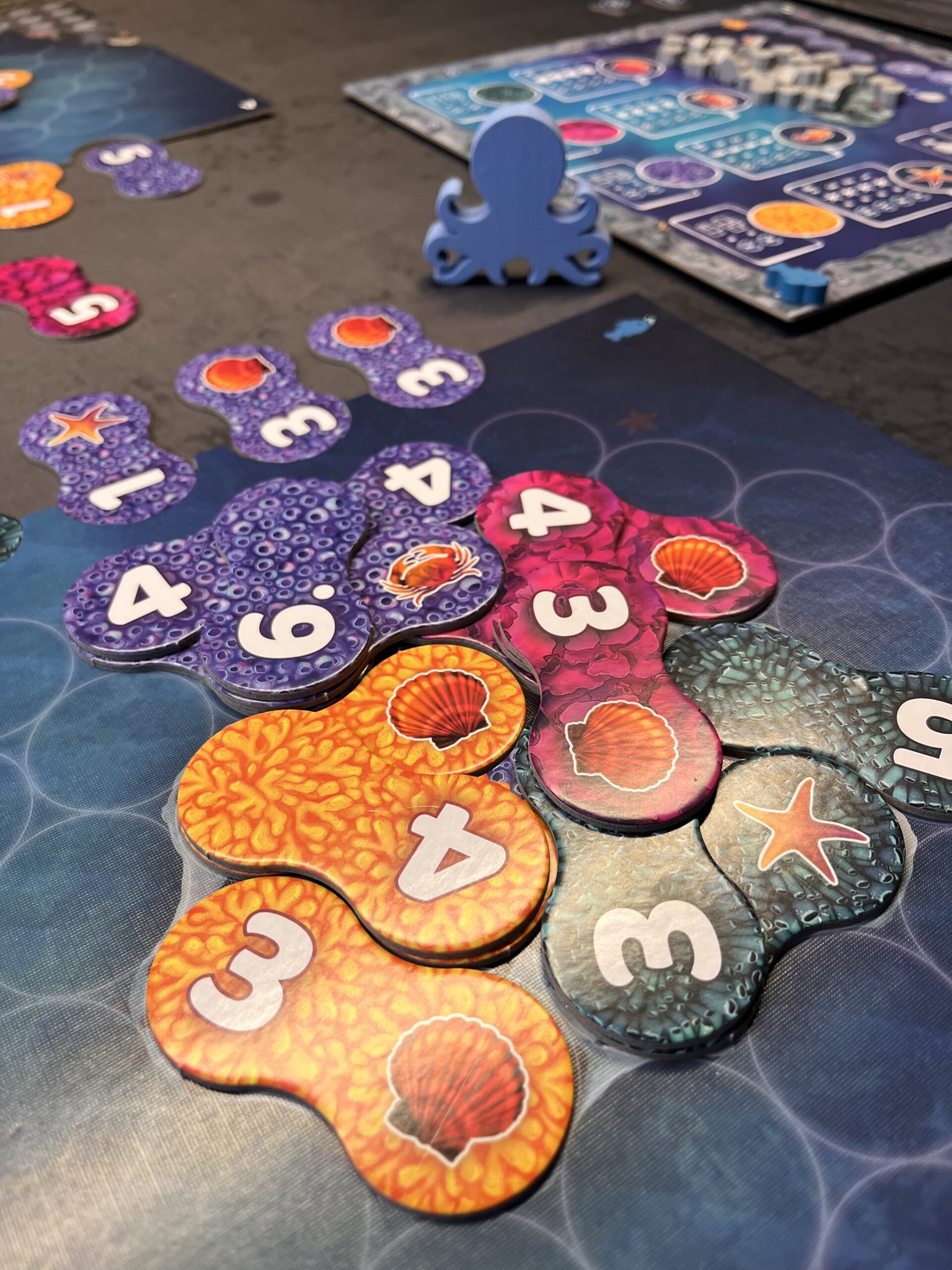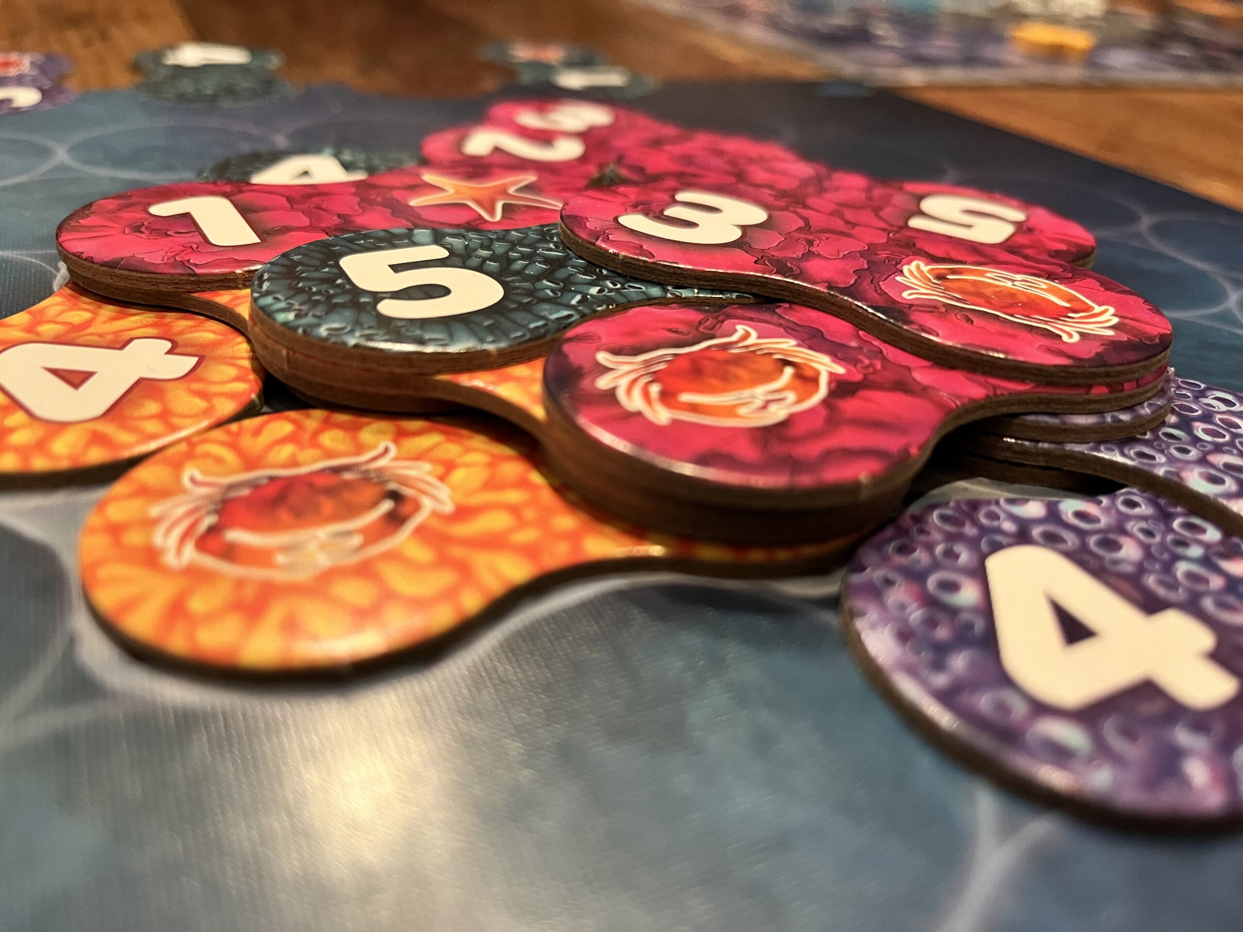 Und nicht nur das – es gibt einen weiteren Aha-Effekt: Sobald Du etwas gewertet hast, kannst Du Plättchen gewerteter Farben auch überbauen, um diese als Sockel für andere Korallen zu nutzen, ohne Kalksteine beschaffen und verwenden zu müssen. Das ist äußerst praktisch, geht aber zu Lasten der Farbmehrheiten-Wertung bei Spielende. Ein Dilemma, das das gesamte Spielt andauert: Du versuchst, effizient zu bauen, hast dann aber ggf. zu wenig Luminos in der entsprechenden Farbe, um diese bei der Gebietswertung einzubringen.