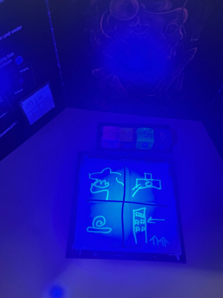 Und schon beginnt die Auswertungsphase. Beginnend mit der Person, die die Sanduhr umgedreht hat, präsentiert ihr im Uhrzeigersinn eure Werke und leuchtet mit eurer UV-Lampe auf euer Blatt.