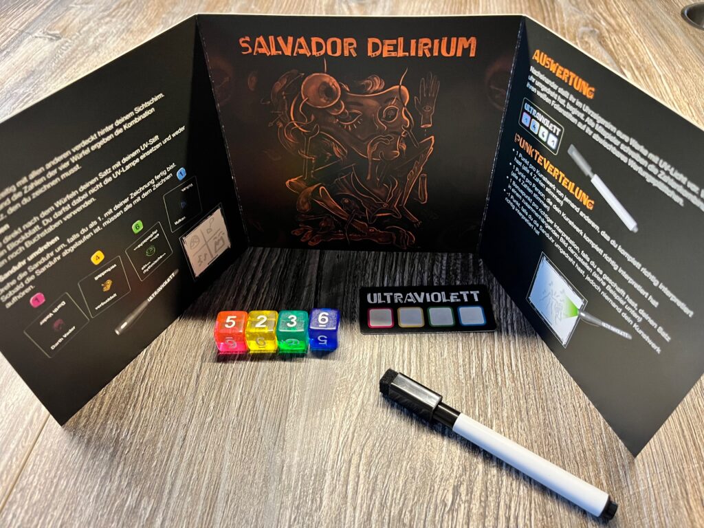 In Ultraviolett erhalten alle Mitspielenden einen Sichtschirm, ein kleines Blatt zum zeichnen einen Folienstift, ein abwischbares Wertungsplättchen, vier Würfel in den Farben pink, gelb, grün und blau und einen UV-Stift mit UV-Lampe.