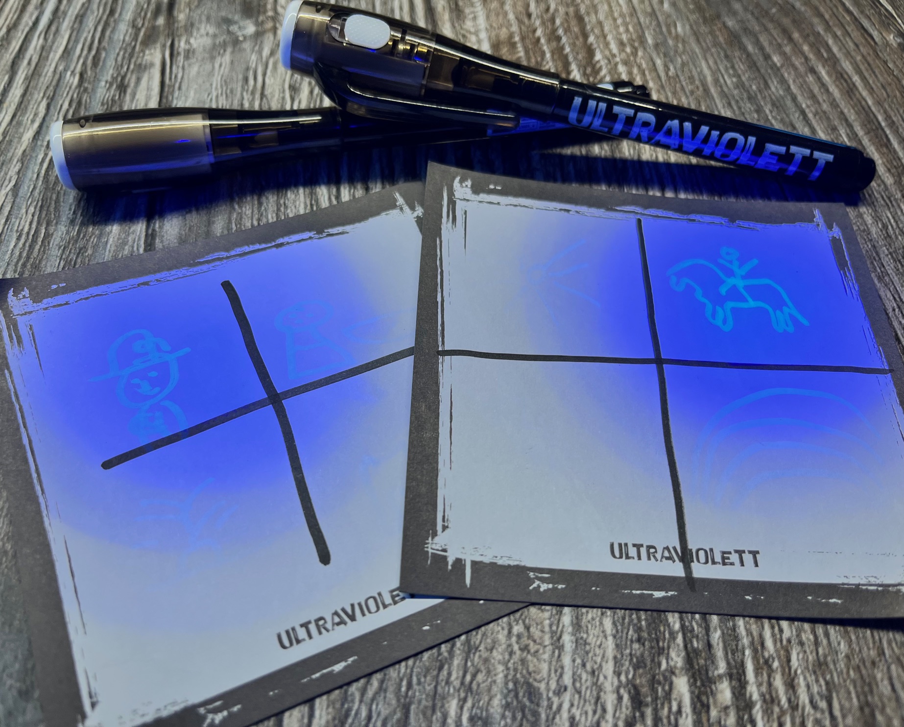 Ultraviolett ist ein Zeichenspiel mit neuem Ansatz: Das Malen mit der unsichtbaren Tinte und dem “Sichtbarmachen” mit UV-Licht-Stiften in der Auswertungsphase sind eine originelle Spielidee, die viele neugierig macht und spontan zum Mitmachen einlädt.