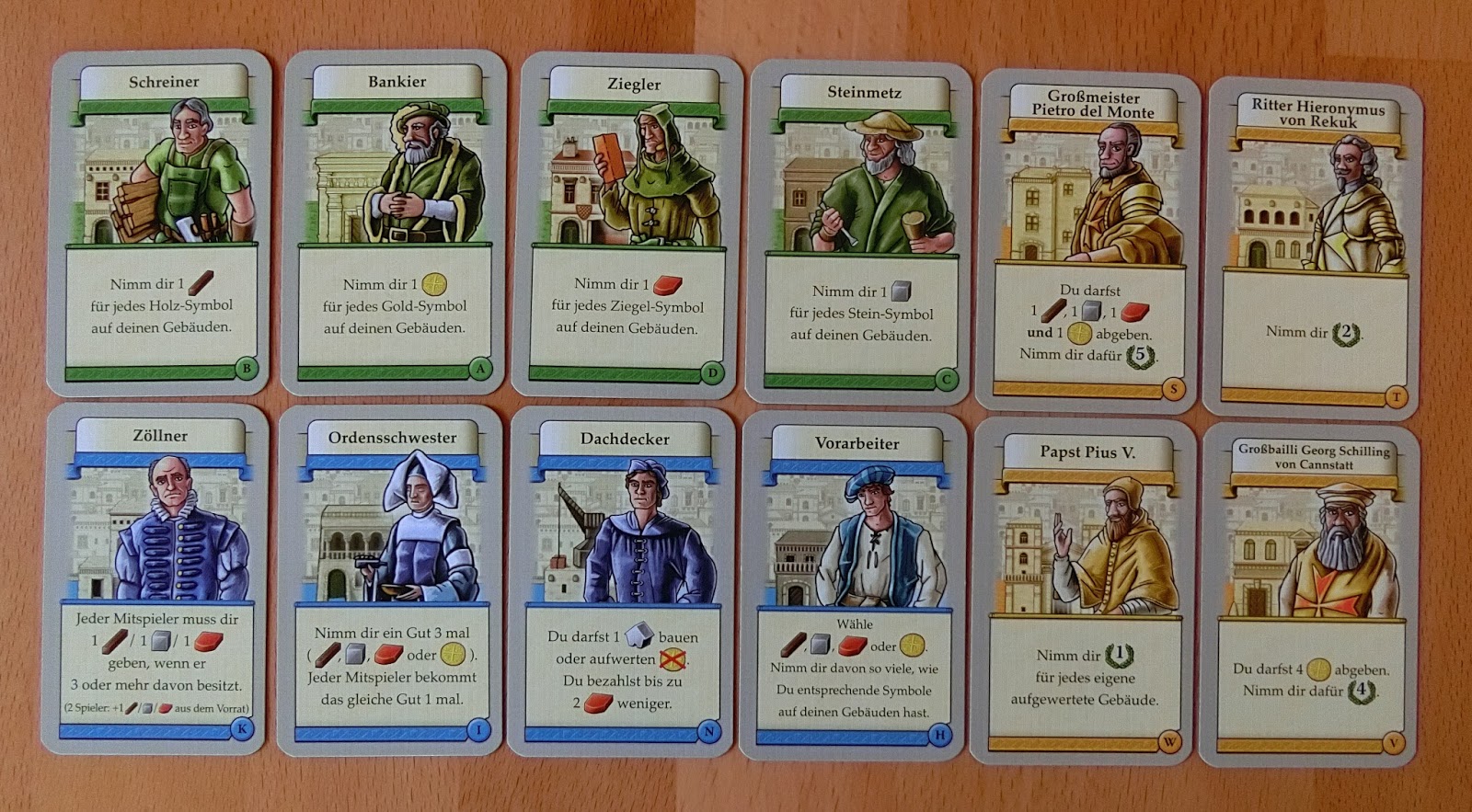 Dann werden entsprechend der Reihenfolge drei der fünf Handkarten ausgespielt und die angegebenen Funktionen ausgeübt (Ressourcen nehmen, Häuser bauen oder aufwerten, Karten kopieren, die Figur Jean de la Vallette bewegen etc.). Teilweise kann man mit seinen Karten die Mitspieler ärgern oder über Persönlichkeiten Sonderboni und Siegpunkte (direkt oder am Ende des Spiels) erwerben. Wichtig ist es zum einen Jean de la Vallette auf der Straßenleiste sowie Häuser in der Nachbarschaft im Blick zu haben, um entsprechende Bauerleichterungen zu genießen.