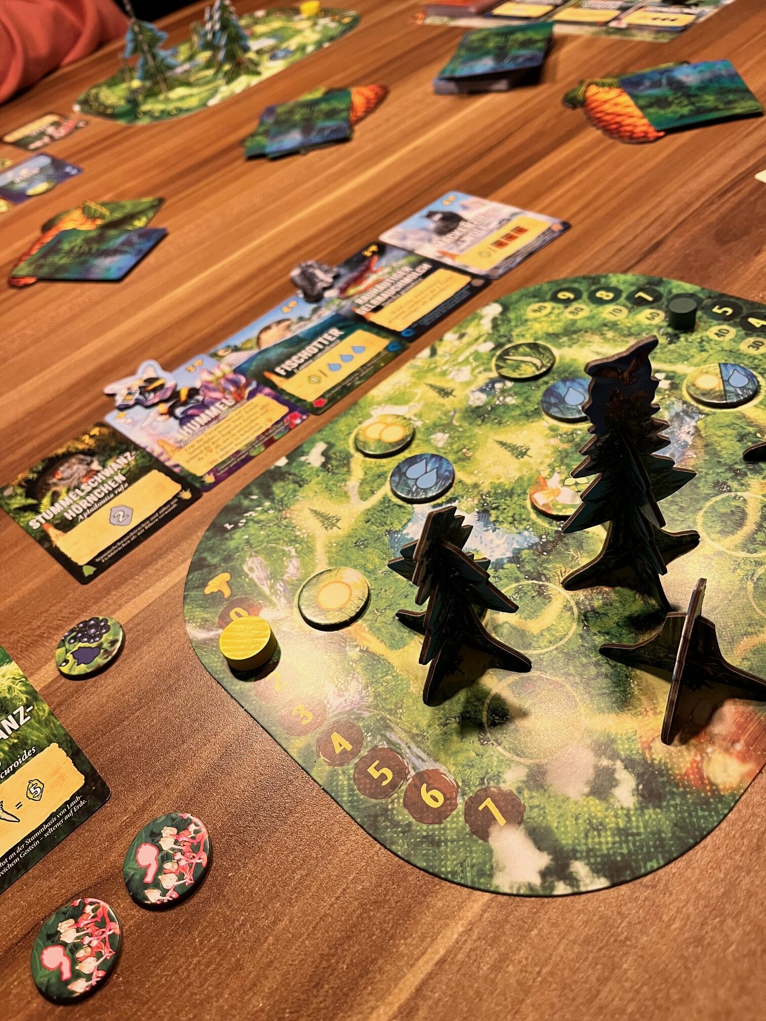 Beim Einstieg hilft auch das eingängige Spielprinzip: Kartensammelplatz durchsuchen, entscheiden “Nehmen“ oder „Wieder weglegen“ und ggf. den nächsten Stapel durchsuchen. Das ist nicht schwer zu verstehen und kann auch in der ersten Partie mit neuen Mitspielenden sehr gut erklärerisch begleitet werden. Und das ist auch notwendig, denn es ist sehr viel los auf dem Tisch, was anfänglich die Übersicht nimmt: Zwischen uns sowie in der Mitte die Sammelplätze mit der Kartenauslage, der Nachziehstapel, der Stapel mit den Karten, die man ggf. bei Rundenende braucht, die allgemeine Auslage mit den Tieren, die eigenen Tableaus mit Bäumen und Bonusplättchen, die eigene Kartenauslage mit den unterschiedlichsten Sets aus Pflanzen, die wir sammeln, die eigene Auslage mit den Tieren und die Boxen mit den Baumteilen.